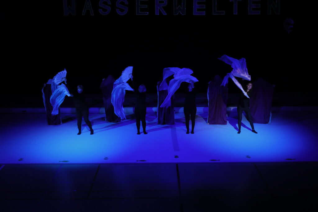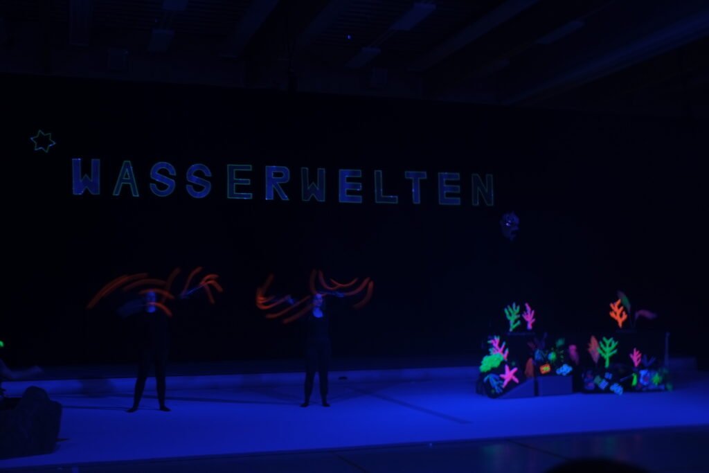 In die geheimnisvolle Tiefsee entführten die Bewegungskünstler unter Leitung von Miriam Berschneider und Renate Trojovsky. Ein Taucher schwamm im dunklen Meer zwischen den in Neonfarben leuchtenden Wasserpflanzen und Fischen herum, um im tiefen Wasser einen Schatz zu suchen.