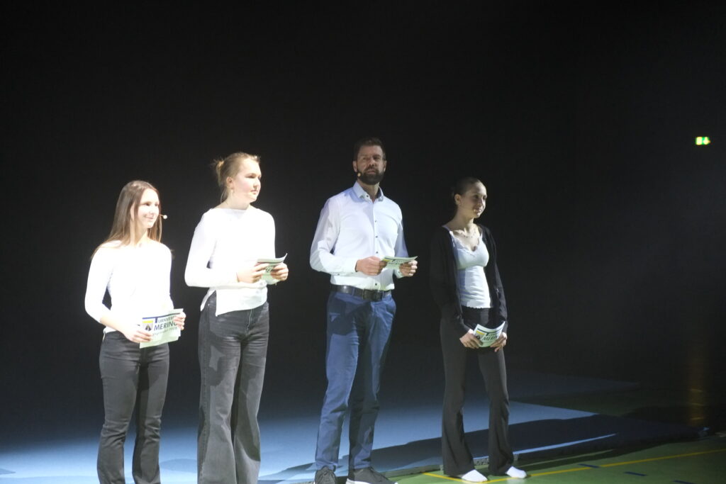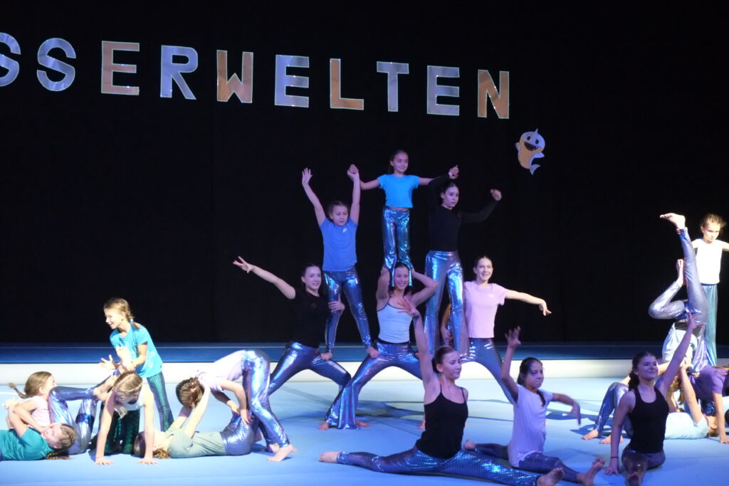 In die Welt der faszinierenden Meerjungfrauen, die davon träumen, sich wie Menschen bewegen zu können, entführten die Turnerinnen im Alter von 10 bis 15 Jahren, die in blau-lila-glitzernden Turnhosen in die Halle kamen. Die beiden Trainerinnen Sofia Strobl und Leni Henne hatten mit ihnen eine spannende Choreographie einstudiert, darunter auch Saltos über die Sprungtische.