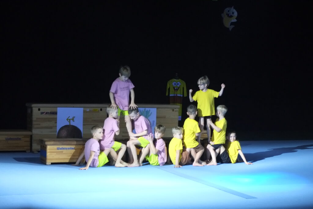 Die seit fast 30 Jahren beliebte Serie „SpongeBob Schwammkopf“ war das Thema der männlichen Turner desselben Alters, die als die Titelfiguren SpongeBob und Patrick in schwarzen oder gelben Shorts und dazu gelben bzw. rosafarbenen T-Shirts ihre Turnübungen zeigten. Das Publikum war ganz begeistert von dieser lustigen Darbietung, die sich Melanie Zierau ausgedacht hatte.