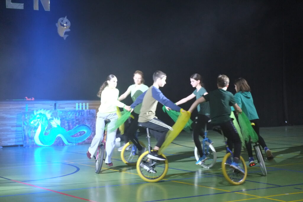 Die Geschichte von Thor, der seinen Hammer verlor und zum Glück wieder finden konnte, zeigte die Truppe der Einradfahrer und -fahrerinnen, die Milena Schwarz und Franziska Reindl leiten.